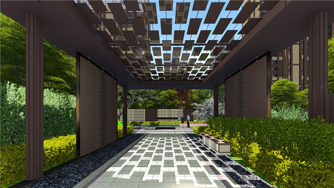 入口儀式空間:設(shè)計(jì)將入口崗?fù)、車?kù)結(jié)合為一體,體現(xiàn)入口尊貴大氣,植物上選擇標(biāo)志性的喬木作為主景樹(shù),地被成片種植,形成歸家禮儀式。